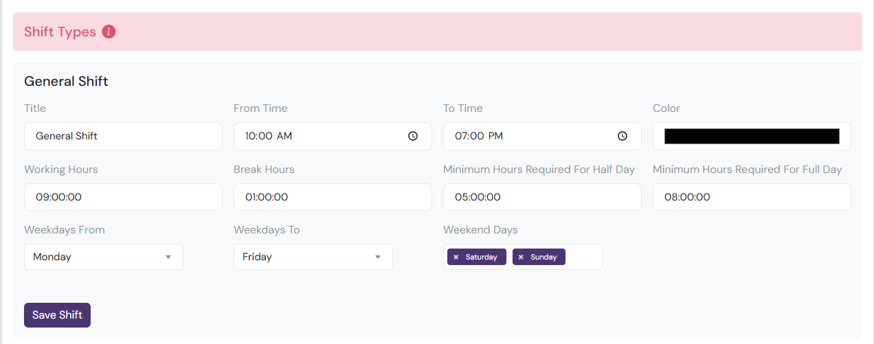 - Assign the work shift (e.g., General).